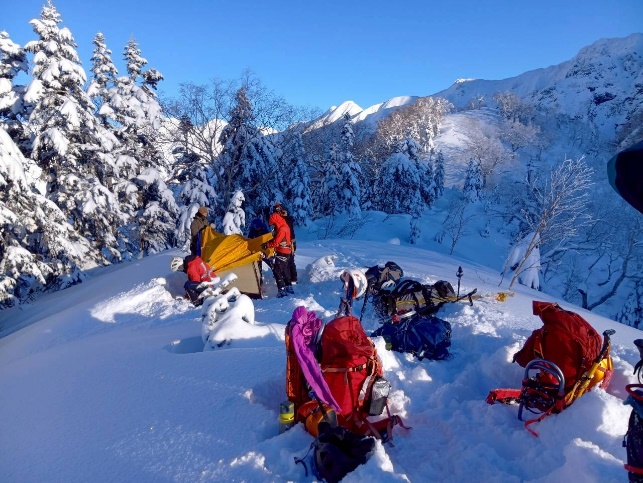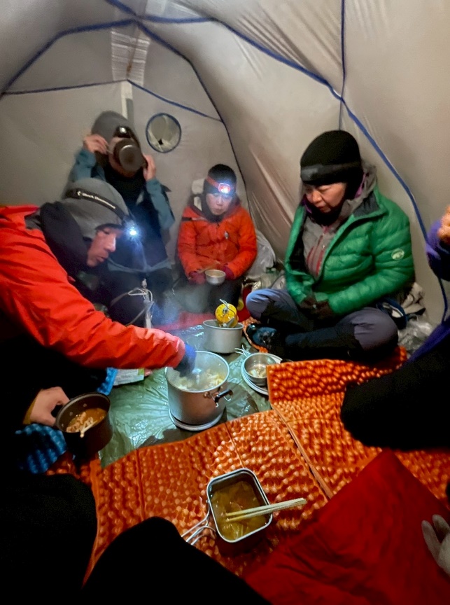 テントは荷物置き程度に簡単な整地で立てただけだったけど、先に戻っていた中嶋さんが、もう1つの2テンも立ててくれていて、お湯を作って待ってくれていて、とても有難かった。1人だと整地し直すにも限界があったようで、かなりデコボコだったが、みんな対応しているのが凄かった。動いちゃダメよの我慢大会でもあったが、私は冬靴で正座や胡坐で座るのは絶対出来ないと思い込んでいたけど、意外とできるものだと言うのが分かった。